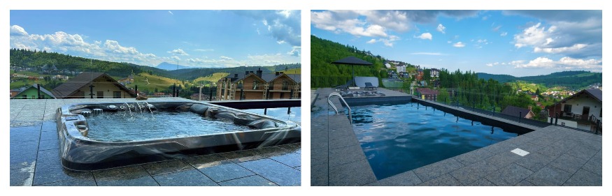 На території Шале Панорама до ваших послуг підігріваємий басейн та джакузі просто неба — з яких відкривається захопливий краєвид на карпатські гори. Навколо розміщені шезлонги та зонтики, де можна розслабитись після купання або просто насолодитися тишею й свіжим повітрям.
